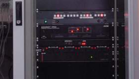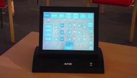 TouchPanel zur Steuerung der gesamten Medientechnik. Licht, Sonnenschutz, Deckenlift und Leinwand werden über EIB gesteuert.