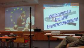 Videokonferenzsystem im Einsatz für eine Produktschulung. Der Referent hält seinen Vortrag in der Firmenzentrale vor Publikum, der Außendienst ist per Videokonferenz zugeschaltet und kann aktiv teilnehmen. Auf der rechten Projektionsfläche erscheint der Powerpoint-Vortrag in XGA Qualität!