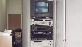 Medienrack im Nebenraum mit Endstufen für Front- / Deckenbeschallung und Basskanal. Signalquellen- umschalter, Funkmikrofonen, Automatikmischern, DAT, CD, S-VHS und Mediensteuerung. |