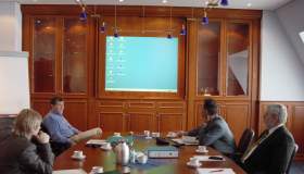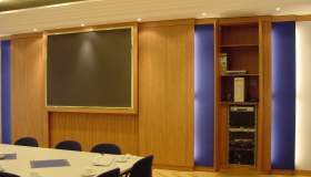 Großer Veranstaltungssaal mit 120Zoll Rückprojektion, in die Schrankwand integriert. Hochwertige Beschallung unsichtbar integriert.