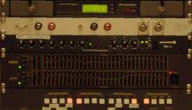 Technikrack mit Endstufen für Front-/ Decken- beschallung und Basskanal, Funkmikrofon, Signal- quellenumschalter und Mediensteuerung. |