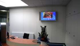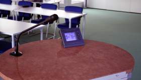 Rednerpult mit TouchPanel zur zentralen Steuerung der Medientechnik sowie Licht und Verdunkelung. Die zu steuernden Geräte befinden sich in einem 19 Zoll Geräteschrank im separaten Technikraum. |