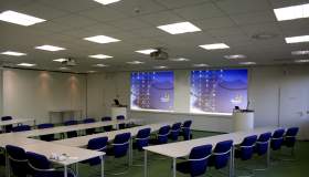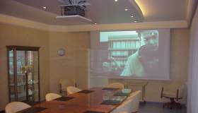 Konferenzraum der Unternehmensleitung. Der Beamer wird über einen Deckenlift herausgefahren. Steuerung der Medientechnik inklusive Licht, Verdunkelung, Lift und Leinwand über ein AMX Funk TouchPanel. |