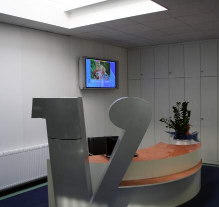 Konferenzraum der Unternehmensleitung. Der Beamer wird über einen Deckenlift herausgefahren. Die gesamte Medientechnik inclusive Licht, Ver- dunkelung, Lift und Leinwand werden über ein AMX Funk TouchPanel gesteuert.